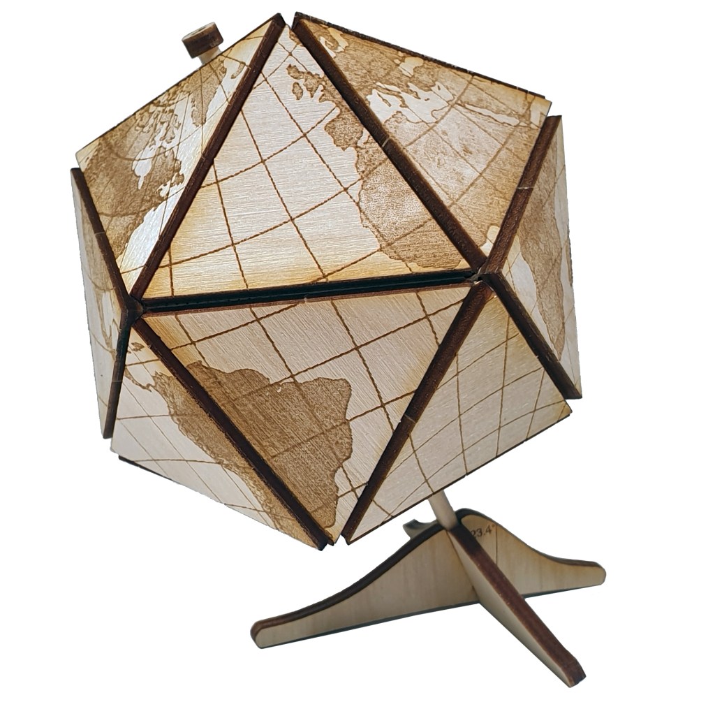 I am currently designing a variety of wooden polyhedral models of the earth. The first one is the icosahedron (a 20 sides polyhedron) with the Dymaxion map projection. Although it sounds complicated it is a simple and fun model to build (see image below). All the models will have a small stand with axle on which the “globe” will rotate.
